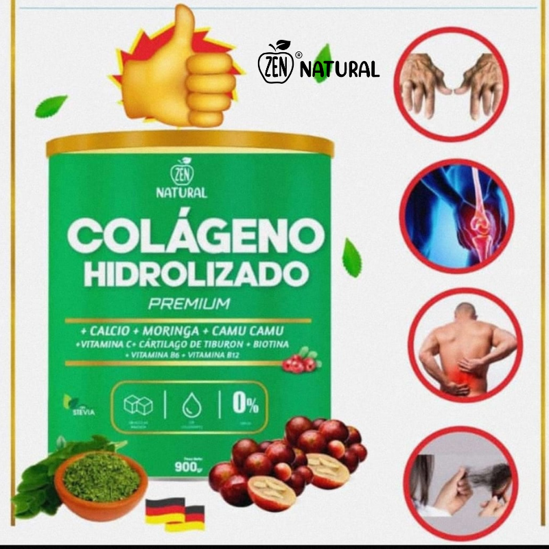 Colágeno Hidrolizado Premium Zen Natural es un suplemento nutricional natural formulado para fortalecer tus articulaciones, cuidar tu piel, uñas y cabello, y mejorar tu bienestar general. Enriquecido con calcio, moringa, camu camu, cartílago de tiburón, biotina y vitaminas C, B6 y B12, este producto contribuye al mantenimiento de huesos y tejidos conectivos saludables. Ideal para quienes sufren de desgaste articular, dolor muscular o pérdida de elasticidad en la piel.